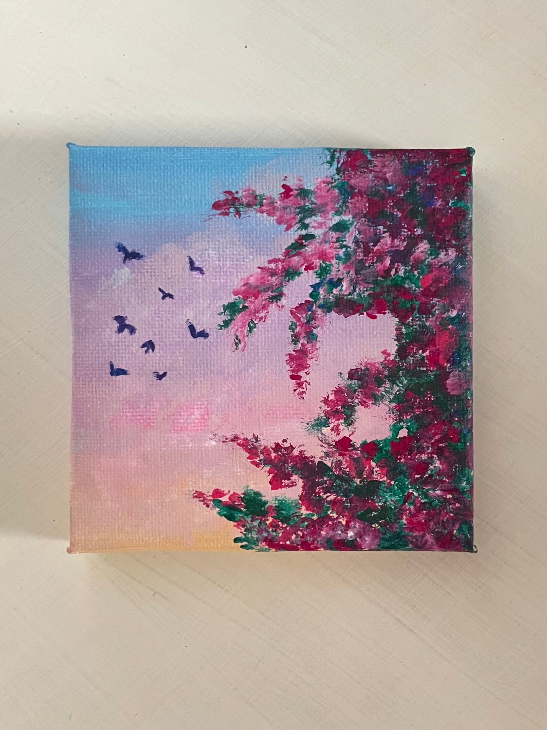 夏の夕暮れ時、ブーゲンビリア越しに見えるカラフルな空に